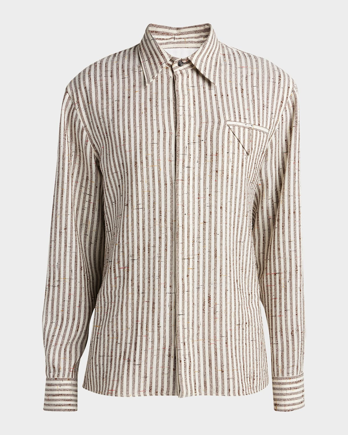 - Bottega Veneta sport shirt in multicolor knotted stripes - Point collar - Concealed button placket - Chest welt pocket - Long sleeves - Yoked back shoulders - Straight hem - Viscose/silk/polyester - Made in Italy