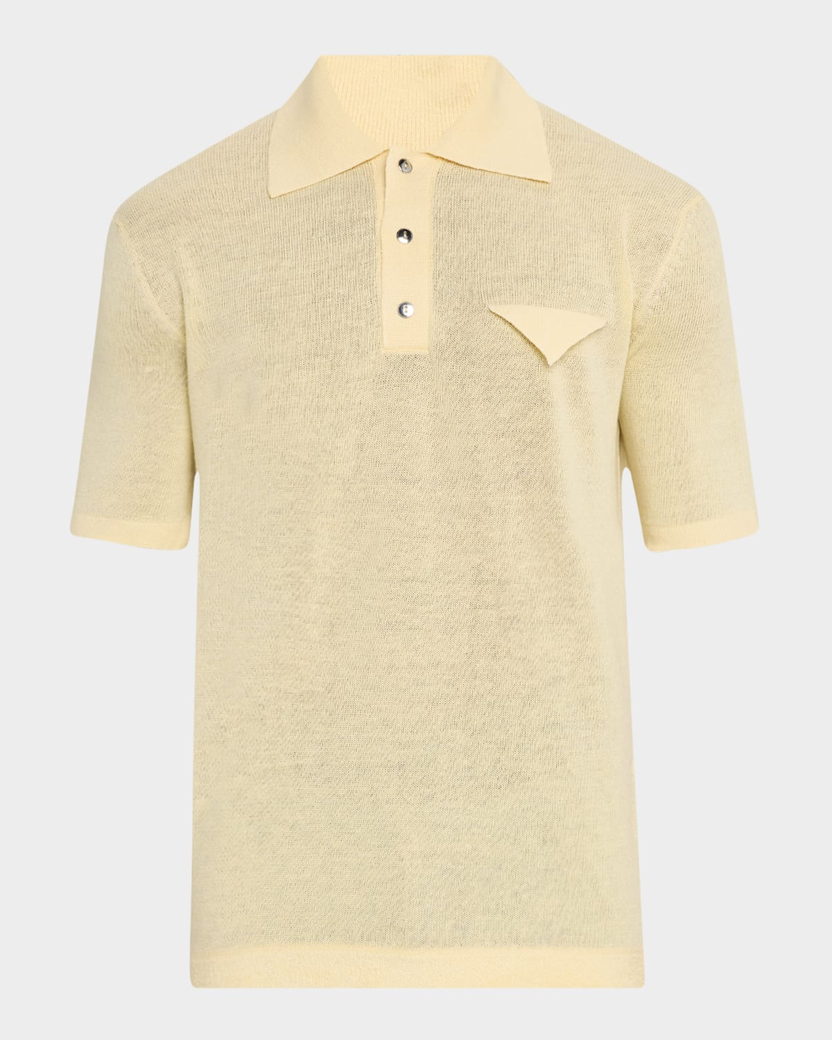 - Bottega Veneta sport shirt in linen-knit - Spread collar; four-button placket - Chest pocket - Cuffed short sleeves - Cuffed hem - Pullover style - Linen/cotton/polyamide - Made in Italy - Model is 6'1"/185cm.