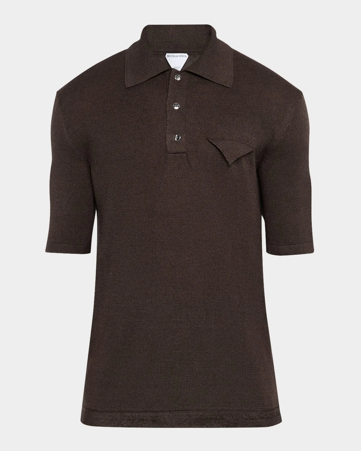 - Bottega Veneta sport shirt in linen-knit - Spread collar; four-button placket - Chest pocket - Cuffed short sleeves - Cuffed hem - Pullover style - Linen/cotton/polyamide - Made in Italy - Model is 6'1"/185cm.