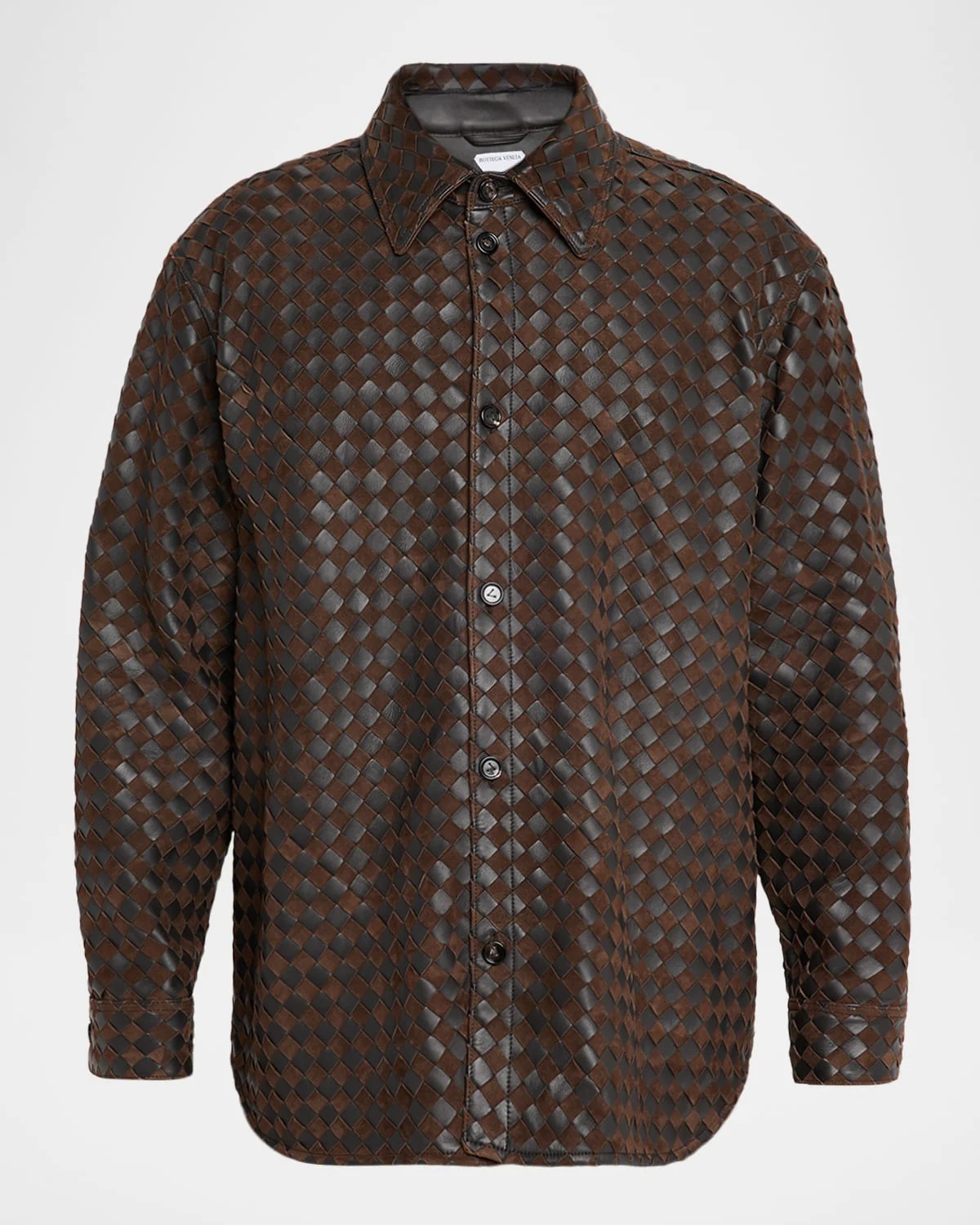 - Bottega Veneta overshirt realised in mixed suede and leather with signature Intrecciato craftsmanship - Point collar - Button placket - Long sleeves - Single-button cuffs - Back yoke - Curved hem - Leather - Made in Italy