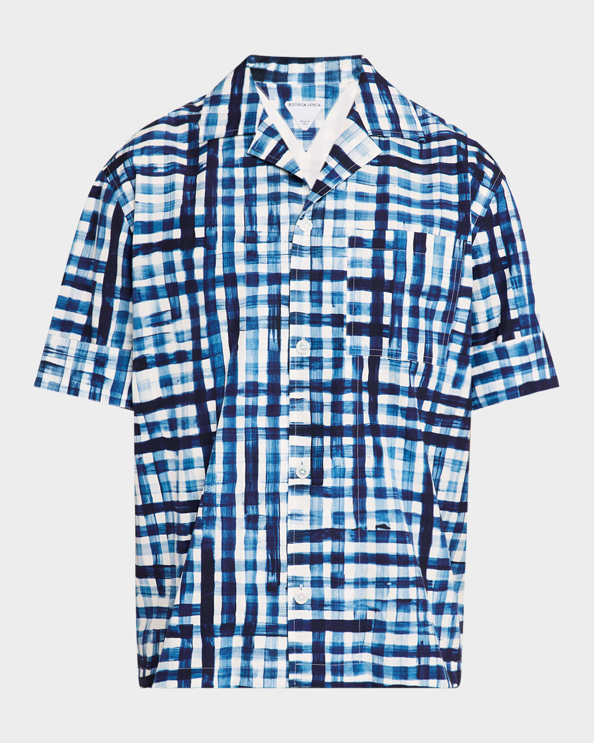 - Bottega Veneta sport shirt in painted gingham print - Camp collar - Chest patch pocket - Short sleeves - Relaxed fit - Cotton - Made in Italy