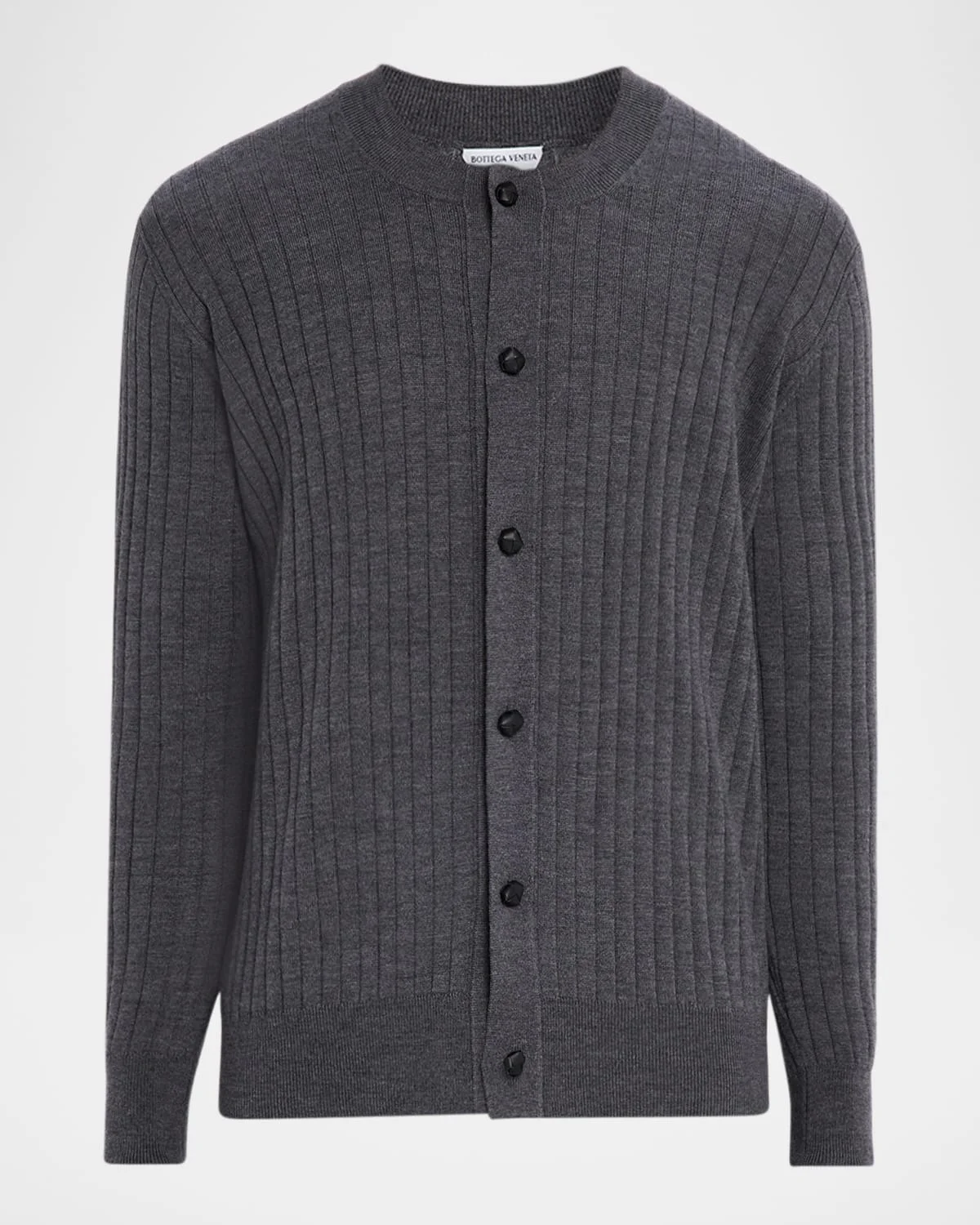 - Bottega Veneta cardigan in ribbed wool defined by leather buttons crafted with intrecciato craftsmanship - Ribbed crew neckline - Button front - Long sleeves - Ribbed cuffs and hem - Wool - Trim: Leather - Made in Italy