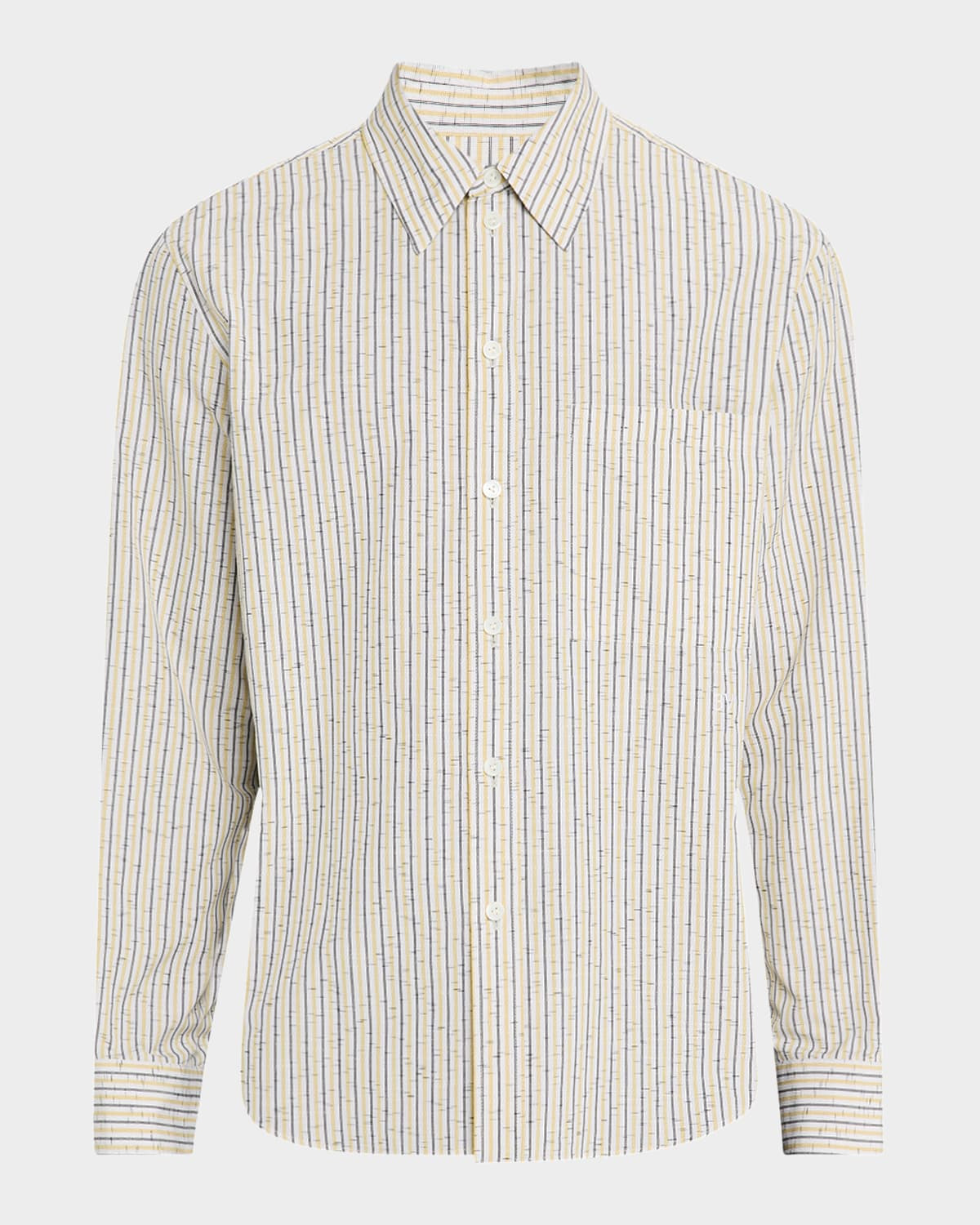 - Bottega Veneta sport shirt in a lightweight linen blend revealing a unique stripe pattern - Point collar - Button placket - Chest pocket - Long sleeves - Single-button cuffs - Pleated back yoke - Shirttail hem - Classic fit - Cotton/linen/nylon - Made in Italy