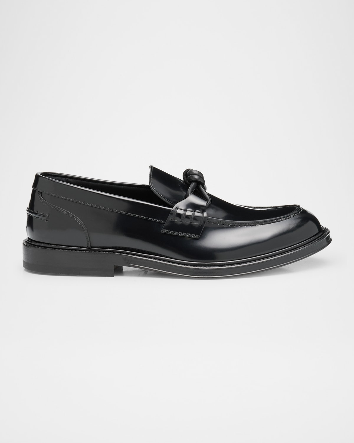 - Bottega Veneta "Tie" loafers realised in brushed leather with the signature knot detail - Stacked heel - Round moc toe - Calfskin lining - Leather outsole - Slip-on style - Made in Italy