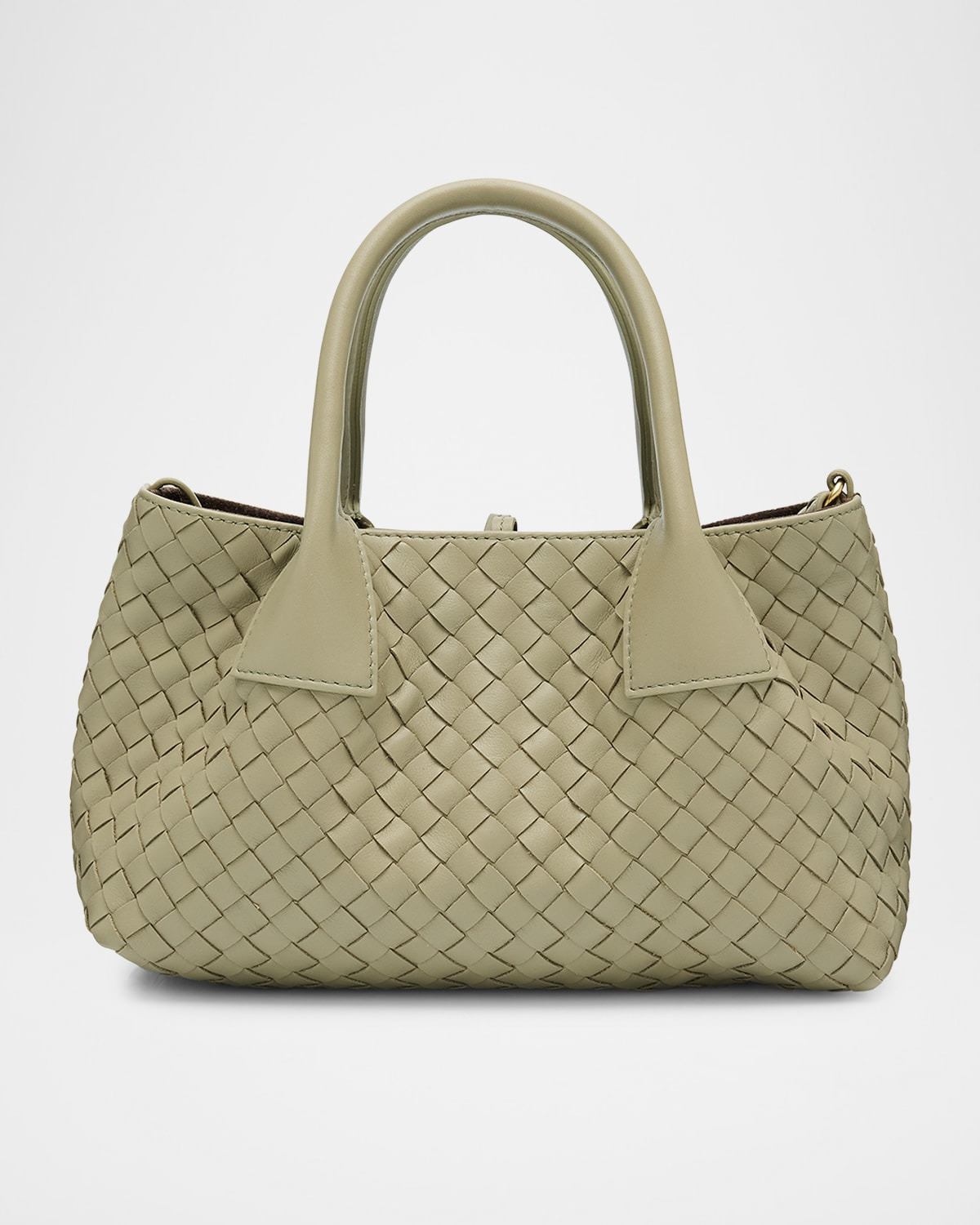 - Bottega Veneta tote bag in intrecciato silky calf leather - Rolled top handles - Detachable, adjustable shoulder strap - Can be worn as a top handle or shoulder bag - Open top with self-tie closure - Interior, leashed zip pouch bag - Approx. 5.9"H x 9.4"W x 4.7"D - Made in Italy