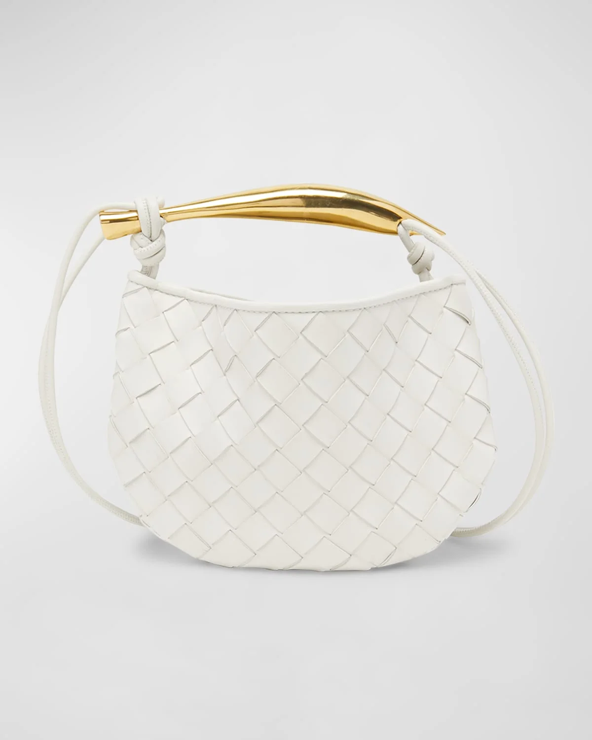 - Bottega Veneta top handle bag in - intrecciato - lambskin leather - Knotted thin crossbody strap - Metal top handle - Open top with magnetic closure - Approx. 4.7"T x 7.9"W x 0.9"D - Made in Italy