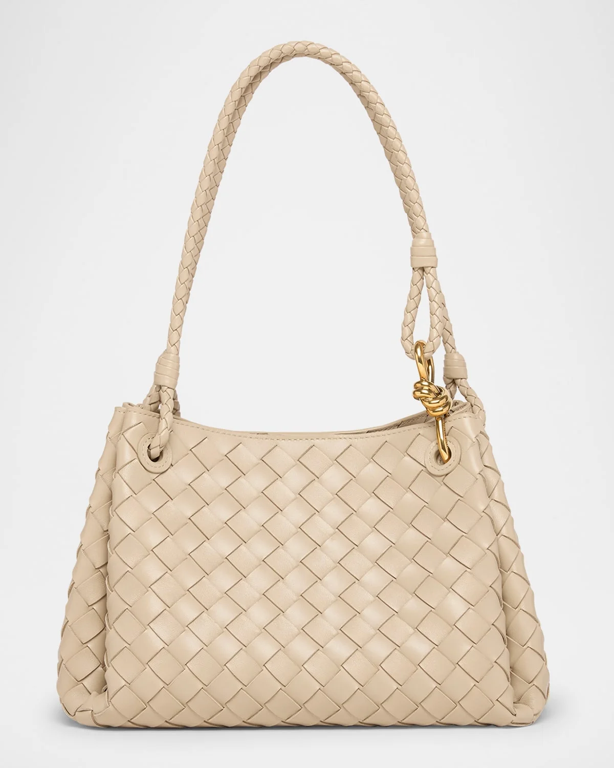 - Bottega Veneta "Parachute" medium shoulder bag in - intrecciato - nappa leather, complete with gold-tone hardware - Shoulder straps, 8.7" drop - Detachable, adjustable crossbody strap - Can be worn as a shoulder or crossbody bag - Open top with magnetic closure - Interior, attached zip pouch - Approx. 7.3"H x 11.6"W x 6.9"D - Made in Italy