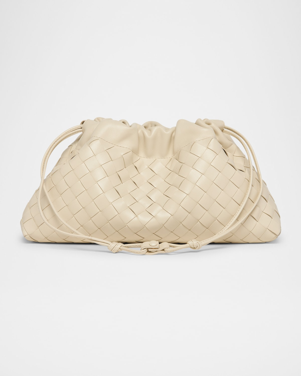 - Bottega Veneta shoulder bag in - intrecciato - leather - Detachable chain shoulder strap - Can be worn as a clutch or shoulder bag - Drawstring closure - Approx. 7.5"H x 13"W x 3.1"D - Made in Italy