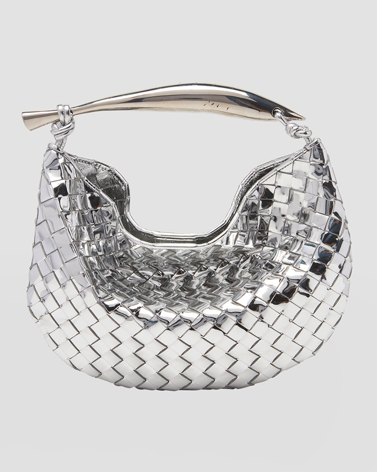 - Bottega Veneta top handle bag in intrecciato metallic leather - Sardine metal top handle - Open top with magnetic closure - Approx. 7.9"H x 13"W x 1.6"D - Made in Italy