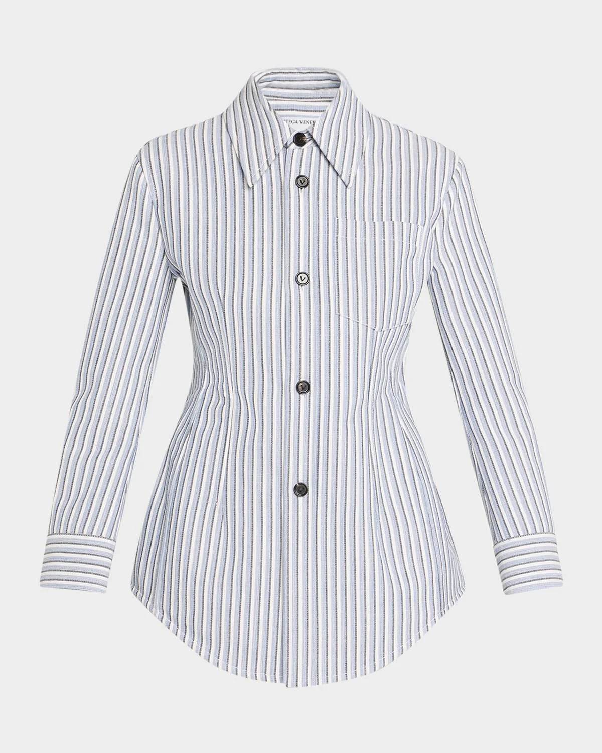 - Bottega Veneta striped jacket in lightweight structured cotton - Spread collar; button front - Long Sleeve; button cuffs - Chest patch pocket - Sculptural fit - Back yoke - Cotton - Made in Italy