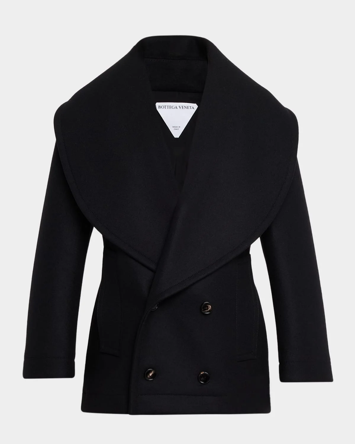 Bottega Veneta coat is crafted of a brushed woolblend featuring exaggerated shawl lapels Shawl collar; doublebreasted front Long sleeves Hip welt pockets Straight fit Hip lenght Button closure Wool/nylon/polyamide Made in Italy