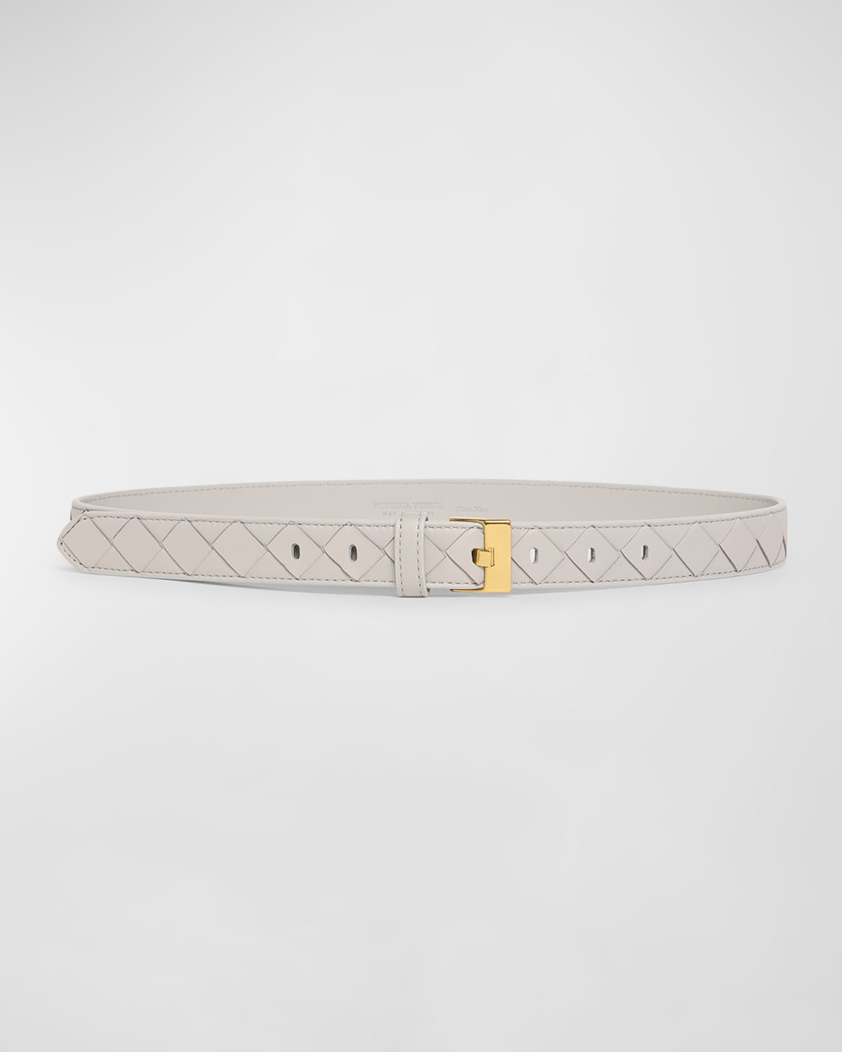 - Bottega Veneta woven belt in lamb leather and brass - Approx. 1"W - Adjustable fit - Frame buckle - Tonal stitching - Tapered end - Made in Italy