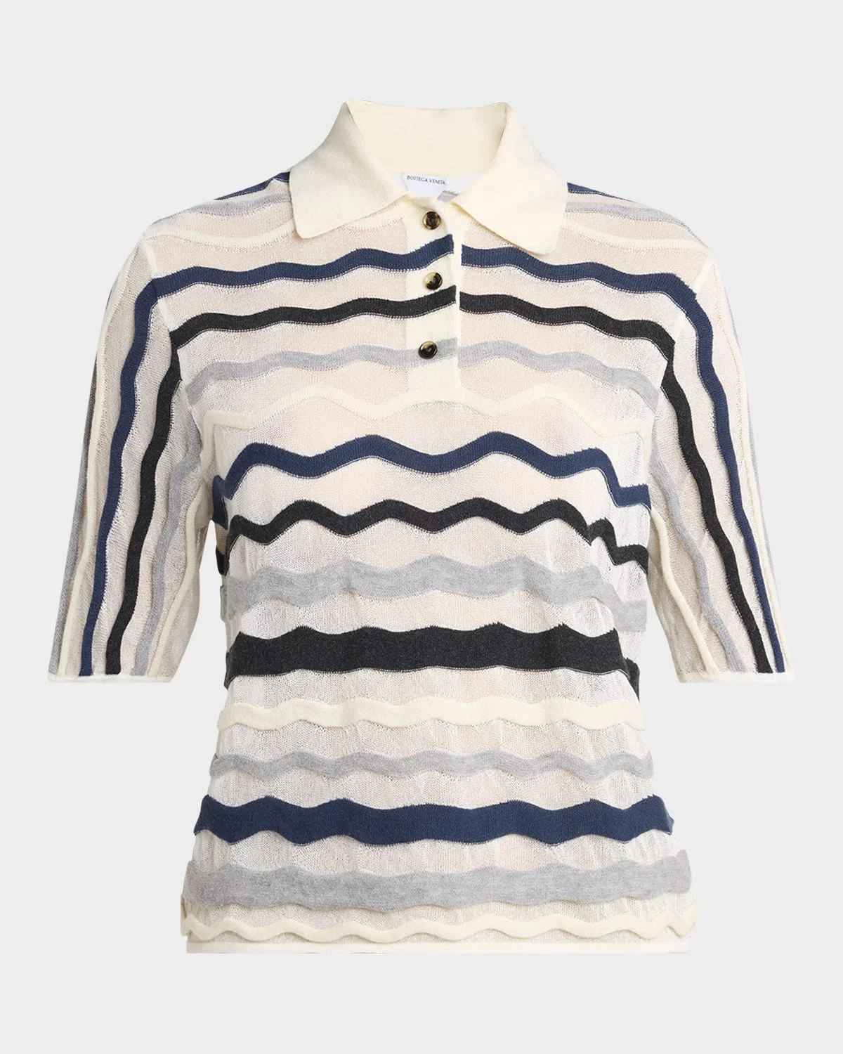 - Bottega Veneta semi-sheer knitwear top features a fluid arrangement of zigzag stripes that add soft movement and visual rhythm - Spread collar; top three-button closure - Half sleeves - Pullover style - Slim fit - Cotton/wool - Imported