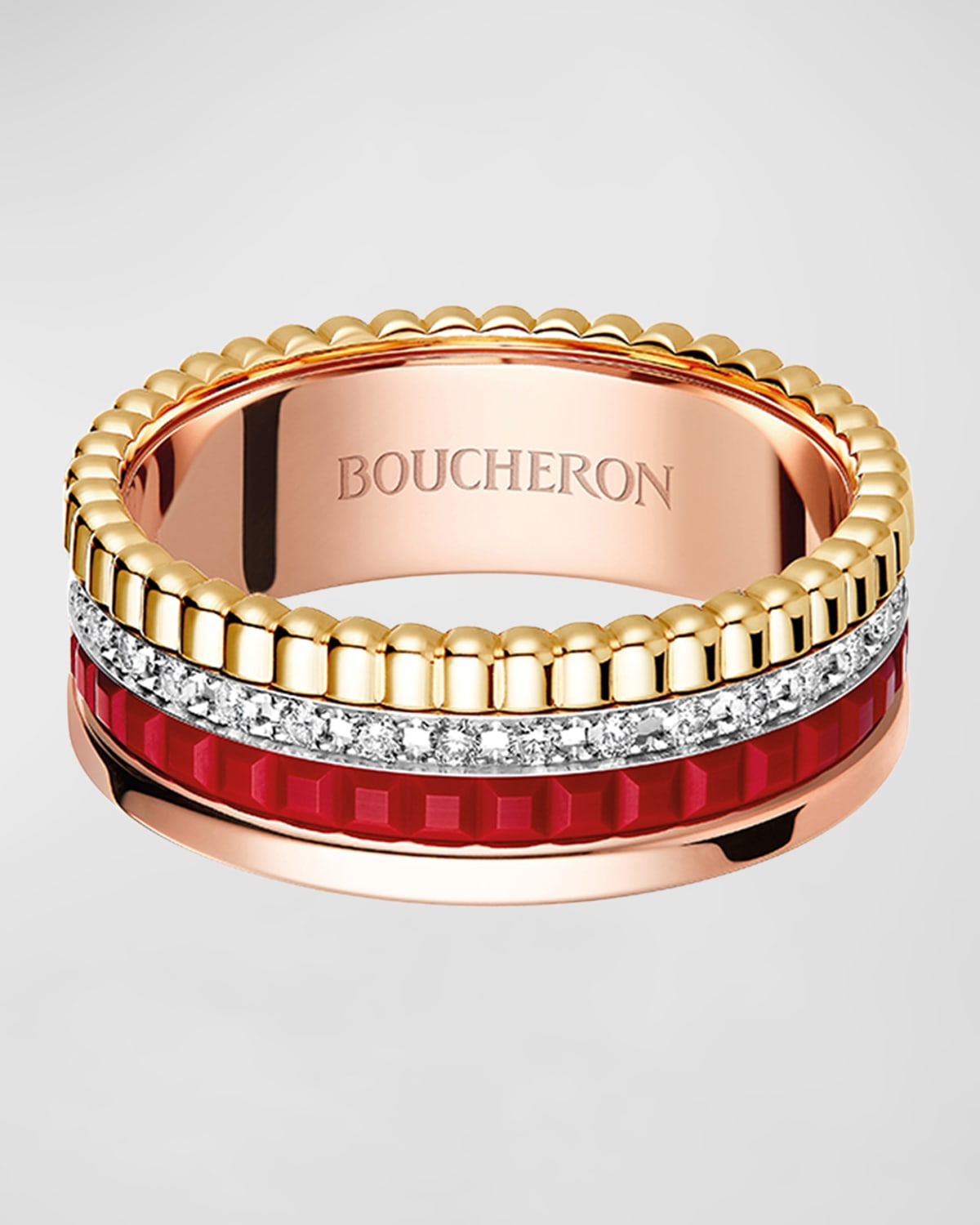 - Quatre, a Boucheron icon, embraces red. On this small ring, Quatre's codes are reinvented in dazzling harmony: the bright red of the matte Hyceram, the brilliance of the line of diamonds, and the intense reflections of the three golds. A daring creation that makes a powerful style statement. - Boucheron ring with black PVD - Approx. 0.77"L x 0.19"W x 0.77"H - 18-karat white gold - To clean or shine this piece, wipe with a clean, dry cloth. - Made in Switzerland - Boucheron Style # JRG02938