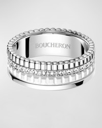 - With Quatre Double White Edition, Boucheron revisits the iconic codes of the collection in white gold, diamonds, and white Hyceram to create this monochrome composition. Like a touch of freshness and audacity, this ring enhances all styles. - Boucheron ring in 18-karat white gold - Approx. 6.7mm wide - White ceramic and white diamonds - 0.26 total diamond carat weight - Please note: - the Quatre rings cannot be resized - To clean or shine this piece, wipe with a clean, dry cloth - Made in France - Boucheron Style # JRG03277 - Size Note: Runs small; we recommend ordering one size up.