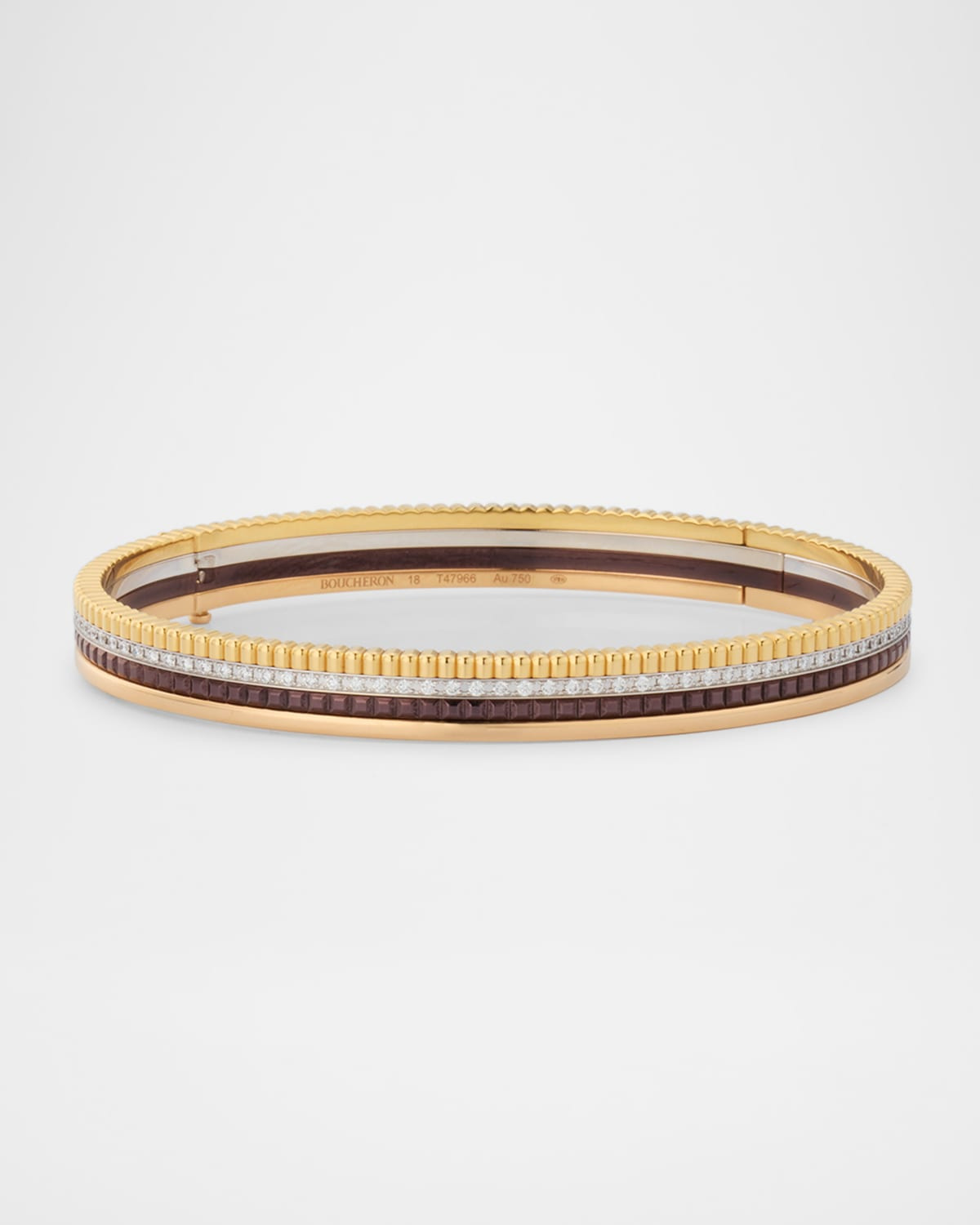 - Boucheron bangle is crafted in tricolor gold with mixed-media elements. This bracelet features brown PVD, white diamonds and a hidden hinge. - Approx. 6.7mm wide - Polished 18-karat yellow, white and rose gold - 98 diamonds; 0.78 total carat weight - Hinged opening - Made in Italy