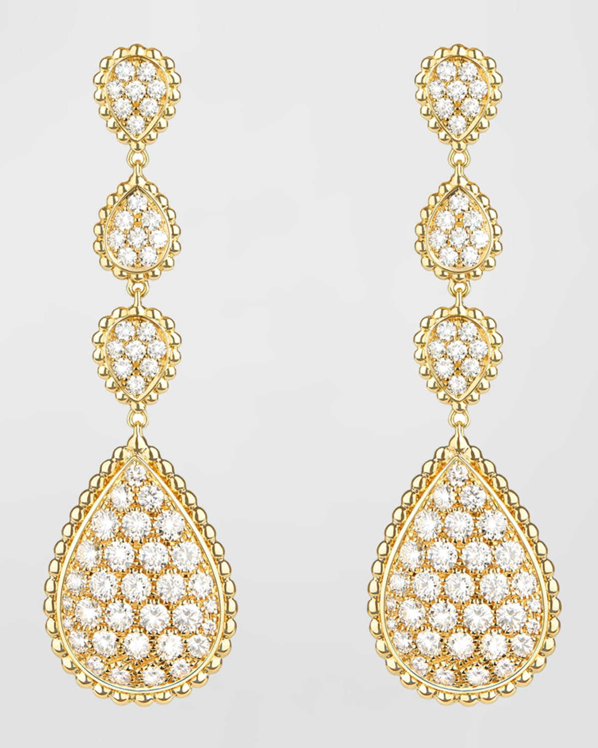 Serpent Boheme drop earrings by Boucheron. Polished 18karat yellow gold hardware. Four teardrops with white diamonds. 112 diamond form pave teardrops. 3.43 total diamond carat weight. Post backs for pierced ears. Made in Italy.