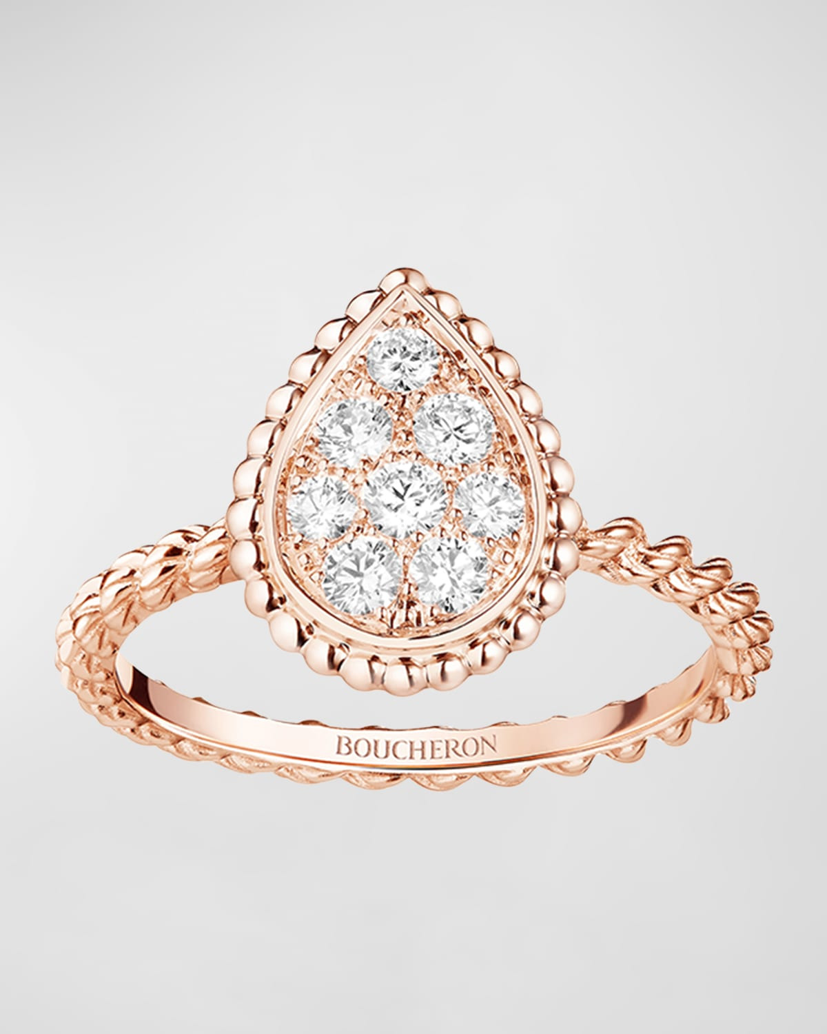- If versatility is one of your defining qualities, the Serpent Boheme ring is made for you. The Boucheron artisan jewelers bring forth the full measure of their talent in its finesse. They skillfully sculpt the twisted chain, the iconic code of the Serpent Boheme collection. This fine, subtle creation is intimate and sensuous. Pink looks so beautiful on you... - Boucheron ring - 18-karat pink gold - Round white diamonds - Total carat weight: 0.34 - To clean or shine this piece, wipe with a clean, dry cloth. - Boucheron Style # JRG02673