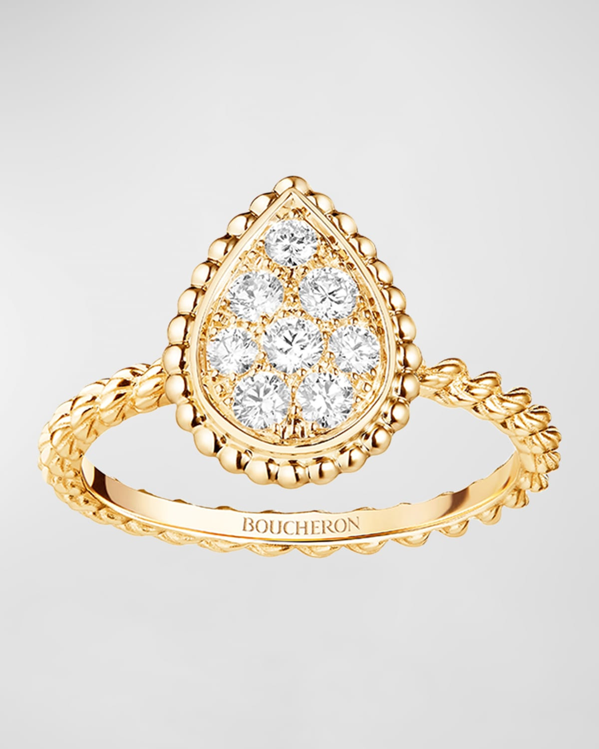 - Yellow gold brings out the collection’s streamlined aesthetic. The Serpent Boheme ring takes inspiration from one of the collection’s iconic codes: the twisted chain. With its exquisite finesse, the ring brings out your sparkle by day and by night. It may be worn on any occasion, on its own or with other creations from the collection, whether in yellow, white or pink gold. - Boucheron ring in 18-karat gold - Approx. 0.74"L x 0.48"W x 0.85"H - Round white diamonds - Total carat weight: 0.32 - To clean or shine this piece, wipe with a clean, dry cloth. - Made in Italy - Boucheron Style # JRG02144