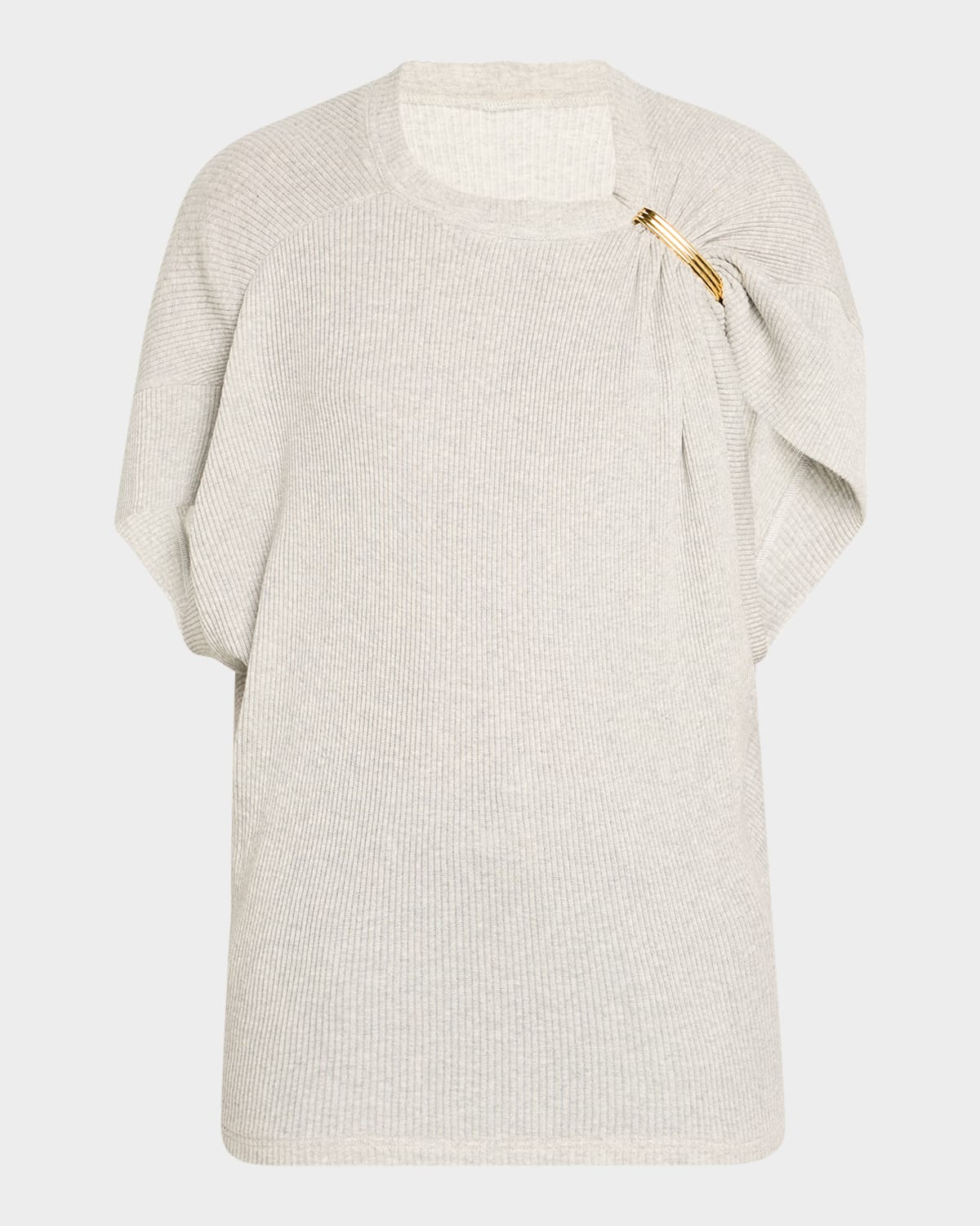 - Brandon Maxwell "Faye" ribbed asymmetric T-shirt embellished with gold-tone hardware - Asymmetric crew neckline - Loose short sleeves - Relaxed fit - Hem falls to the hip - Pullover style - Viscose/elastane - Made in USA from imported materials