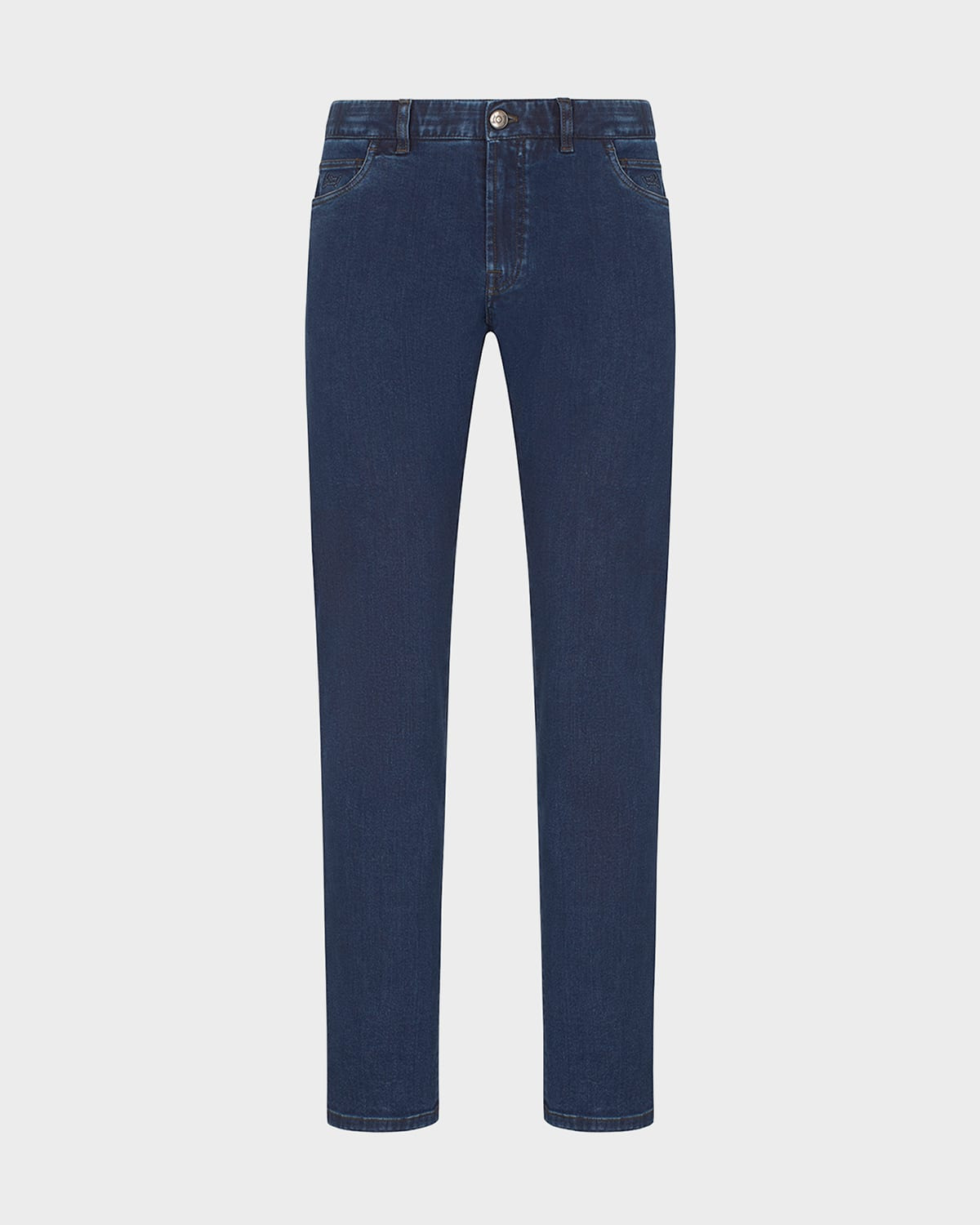 - Brioni jeans in navy denim fabric with classic five-pocket style - Button-zip front; belt loops - Regular rise; flat front - Slim, straight legs - Logo patch at back - Full length - Classic fit - Cotton - Made in Italy