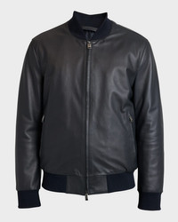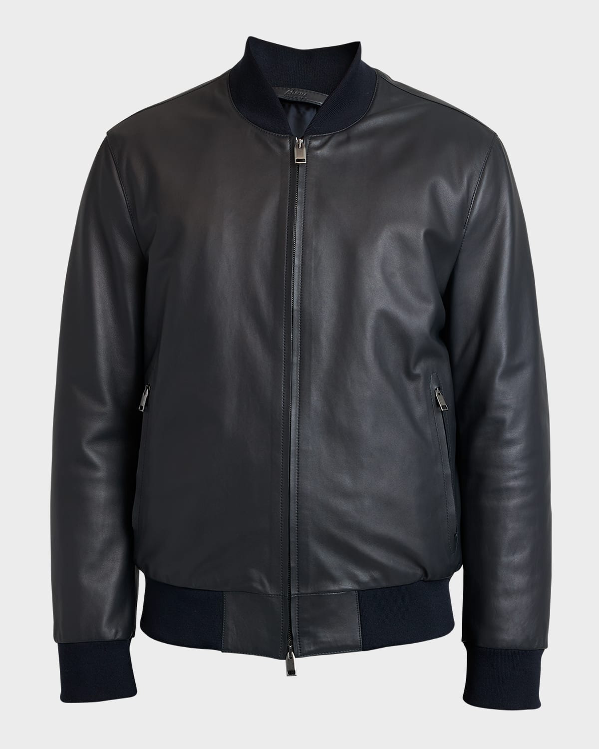 - Brioni bomber jacket in smooth calf leather - Baseball collar; two-way zipper closure - Long sleeves - Side zip pockets - Yoked back - Hip length - Banded cuffs and hem - Wool/cashmere/leather - Dry clean - Made in Italy - Model is 6'1"/185cm.