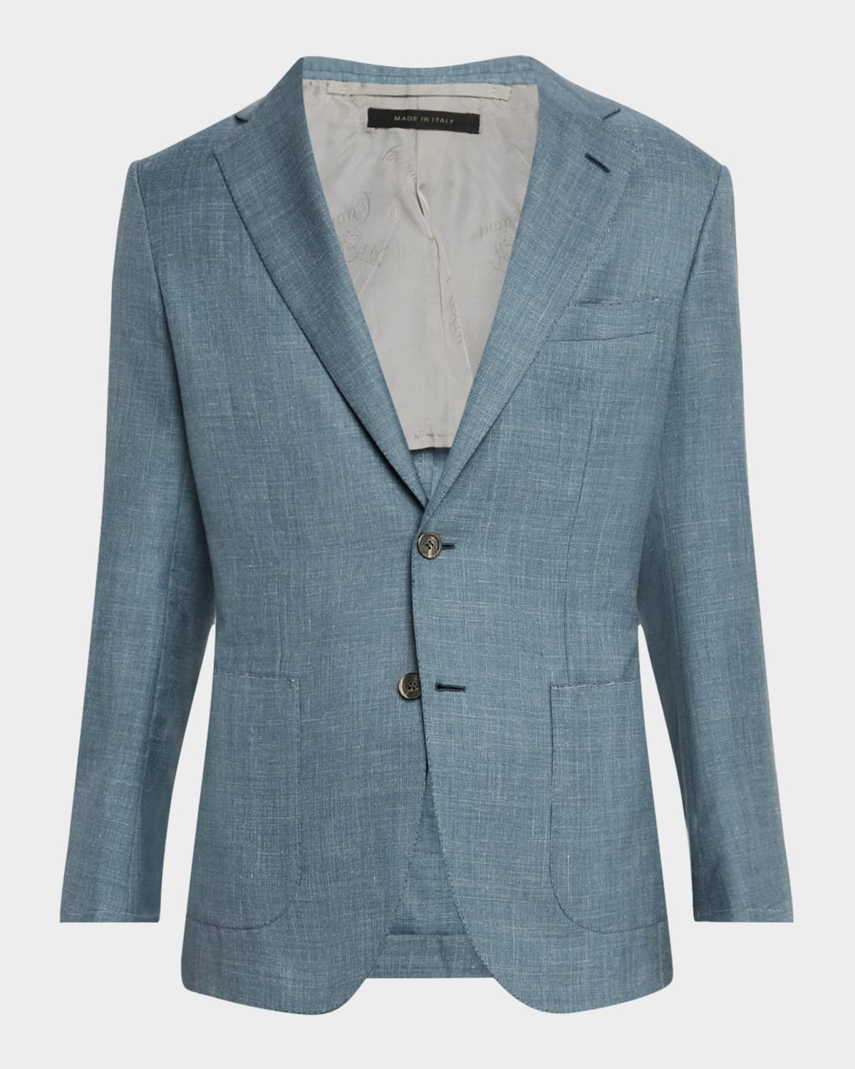 - Brioni blazer in melange weave - Notch lapels - Two-button closure - Chest welt pocket - Hip patch pockets - Unfinished sleeves - Double-vented back - Silk/cashmere/linen - Dry clean - Made in Italy