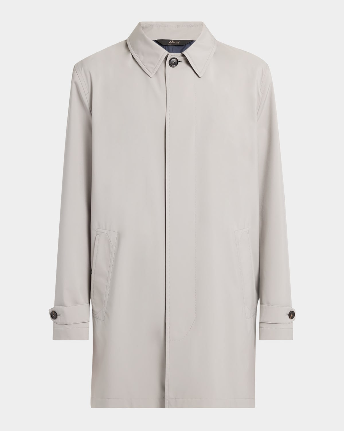- Brioni raincoat in polyester - Hooded neckline - Point collar - Concealed button front - Side welt pockets - Long sleeves - Cuffs with buttoned tabs - Single-vented back - Polyester - Dry clean - Made in Italy