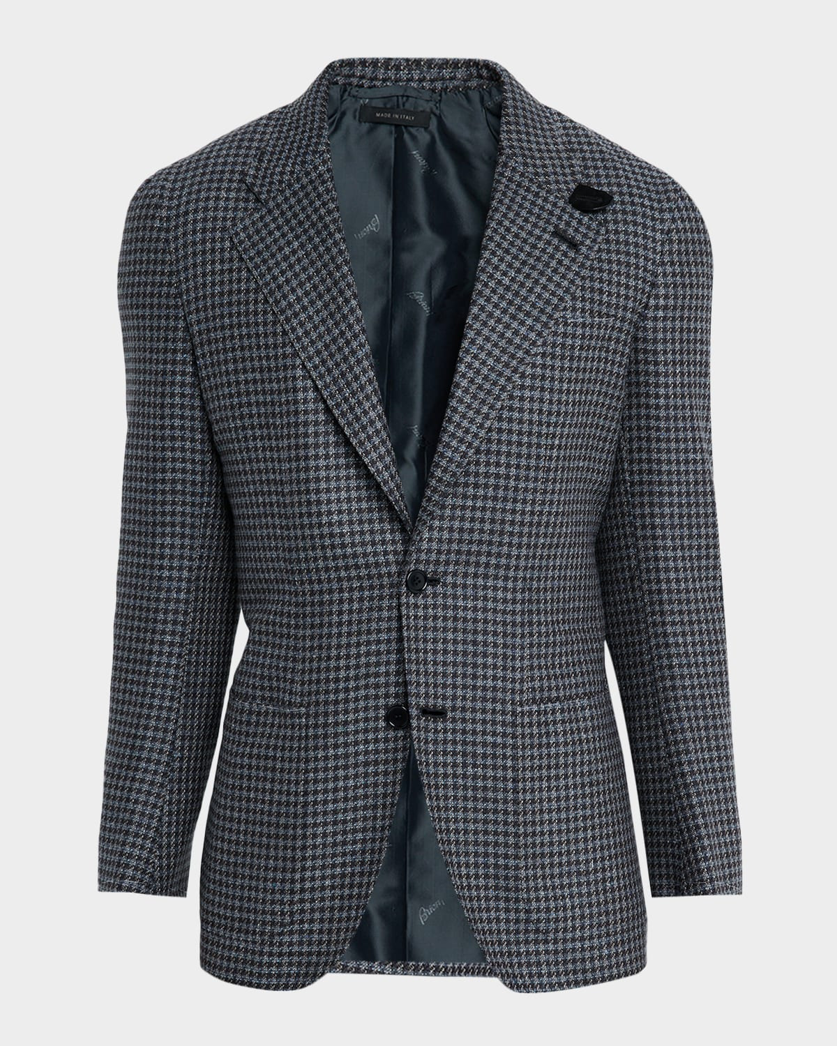 - Brioni houndstooth sport coat in silk and wool for a blend of durability and sheen - Notch lapels - Throat latch - Left lapel buttonhole - Two-button front - Hip patch pockets - Long sleeves - Silk/wool - Dry clean - Made in Italy