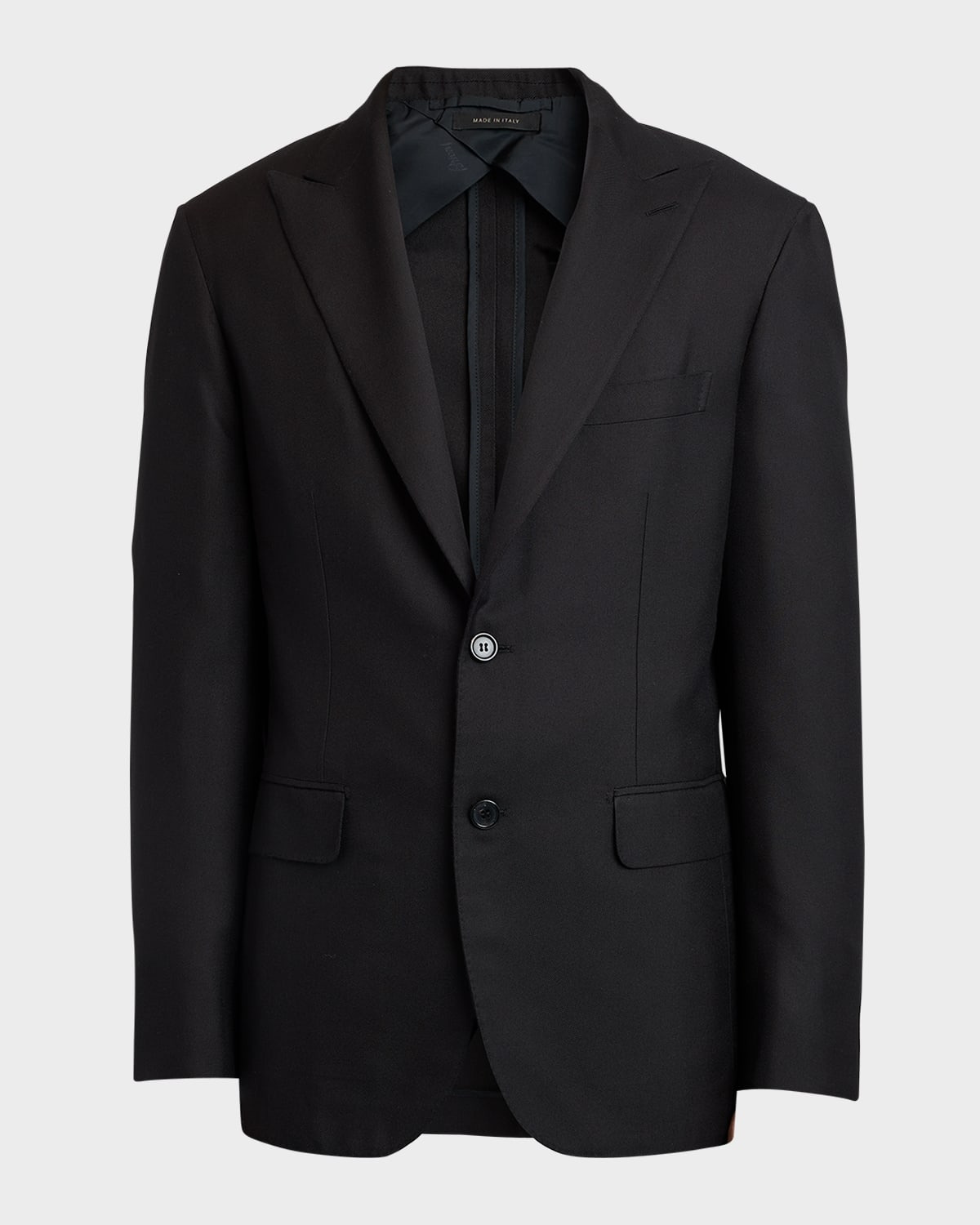 - Brioni blazer crafted of solid silk twill - Peak lapels - Two-button closure - Chest welt pocket - Side flap pockets - Unfinished sleeves - Double-vented back - Dry clean - Made in Italy - Model is 6'1"/185cm.