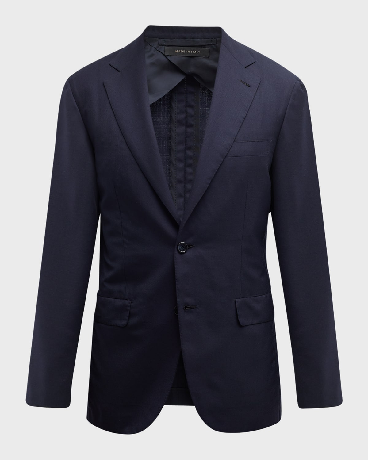 - Men's solid blazer by Brioni - Notched lapels; two-button front - Chest welt pocket - Side flap pockets - Unfinished sleeves - Double-vented back - Wool/silk - Made in Italy - Model is 6'1"/185cm.