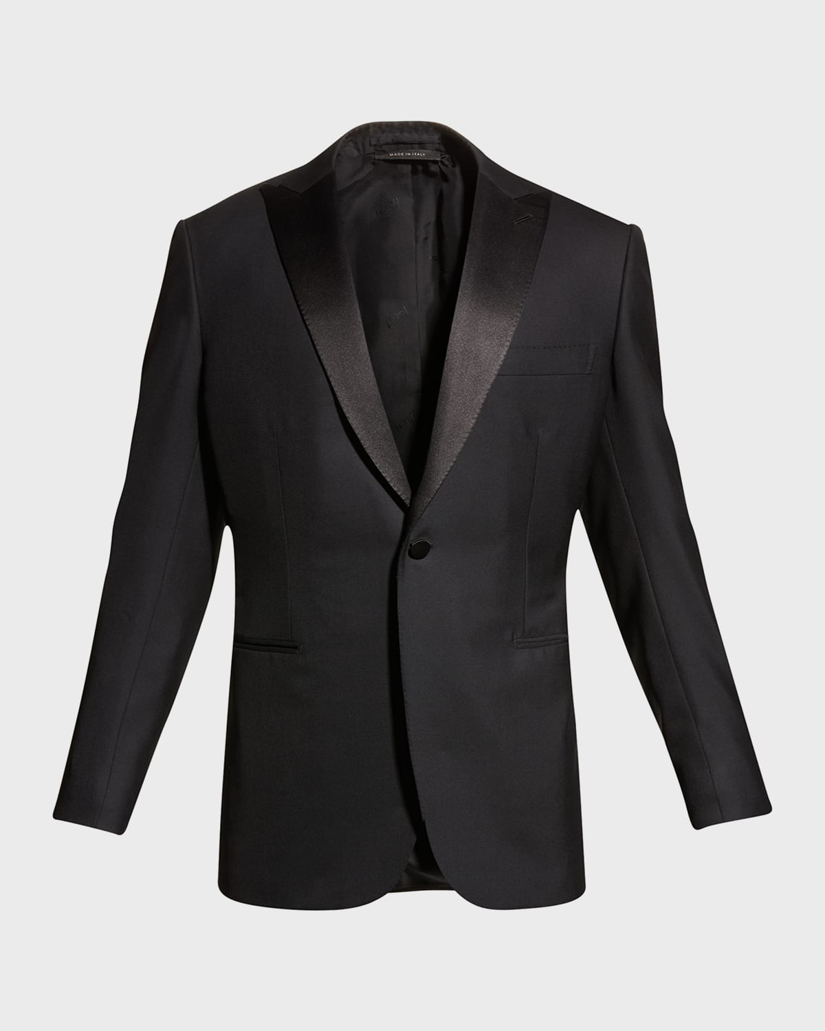- Brioni solid tuxedo with satin lapels - Peaked lapels; single-button front - Chest and side welt pockets - Long sleeves; four-button cuffs - Regular-rise trousers - Full length with creasing - Button/zip fly; belt loops - Unfinished hem to be tailored to desired length - Wool - Made in Italy - Model is 6'1"/185cm.