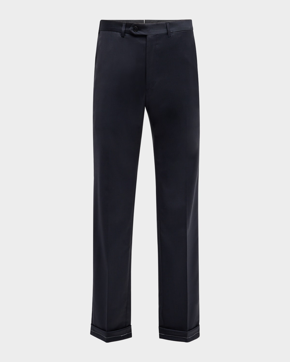 - Brioni "Tigulli" solid trousers. - Mid rise; belt loops. - Side slip pockets; back welt pockets. - Tapered legs. - Button tab closure/zip fly. - Wool. - Made in Italy. - Size Note: Height: 6'1"/ waist 30”/ inseam 31"/ chest 38" - Model is wearing size 48