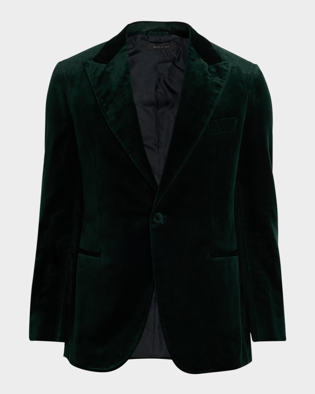 - Brioni blazer in green velvet - Peak lapels - Single-breasted front - Long sleeves - Unfinished cuffs - Chest welt pocket - Hip welt pockets - Tailored fit - Double walking vent - Button closure - Cotton - Dry clean - Made in Italy