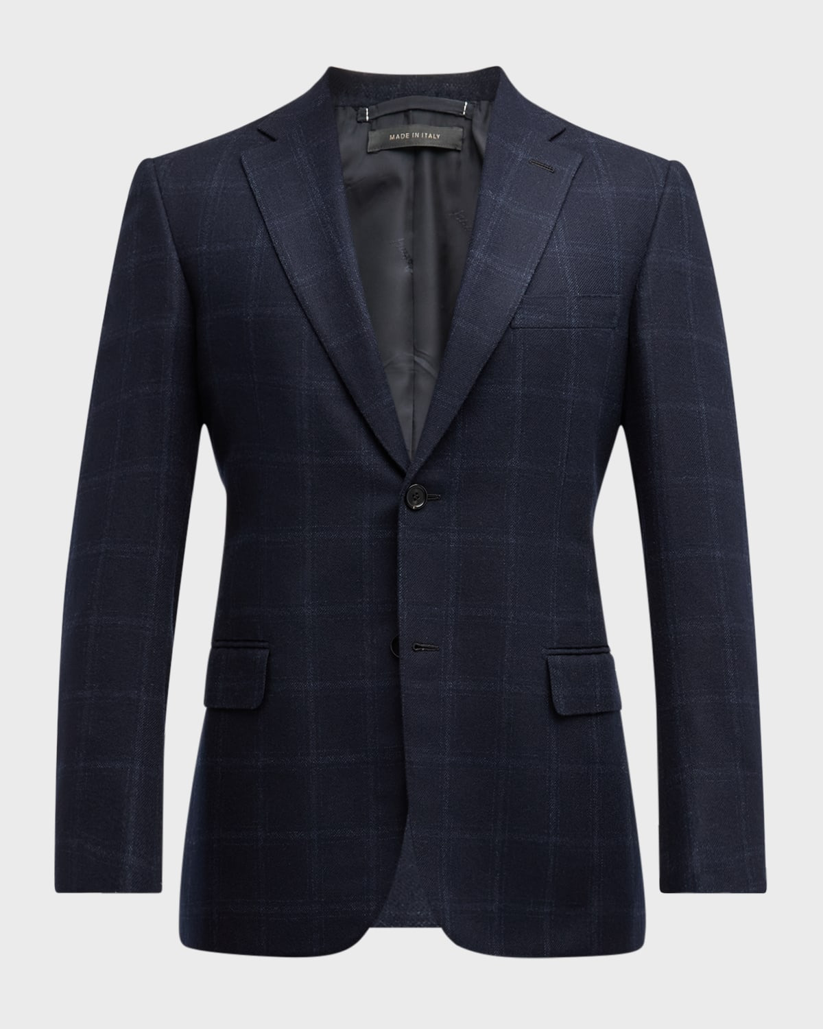 - Brioni sport coat in windowpane check - Notched lapels - Two-button closure - Chest welt pocket - Side flap pockets - Unfinished sleeves - Double-vented back - Wool/cashmere - Dry clean - Made in Italy - Model is 6'1"/185cm.
