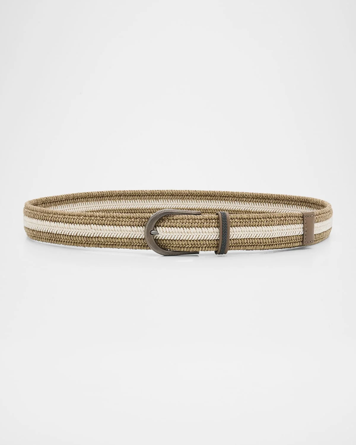 Woven cords give this Brunello Cucinelli belt a rustic, rope-like texture. The design is elevated by leather details and a contemporary metal buckle, while rows of precious monili embroidery on the loop add a signature touch of delicate sparkle. Approx. 1.97"H Monili-embroidered keeper loop Leather end tip Prong closure Adjustable fit Linen/viscose/brass Made in Italy