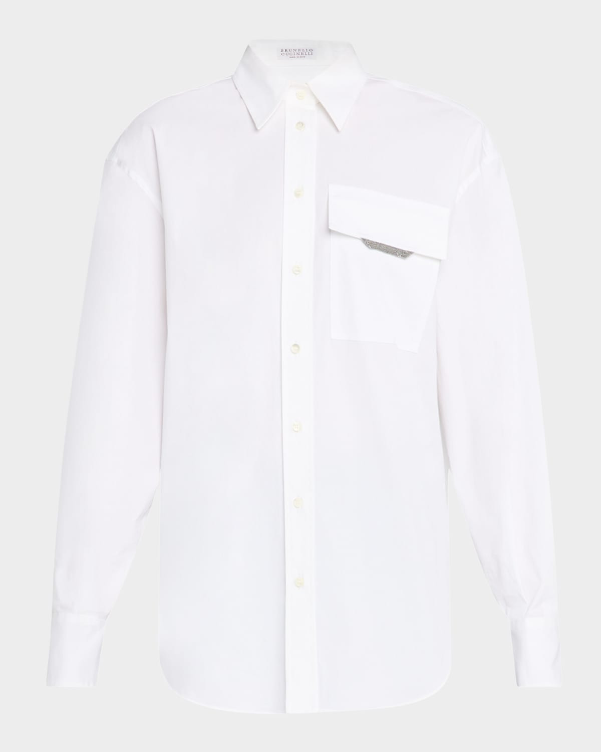 - Brunello Cucinelli cotton poplin shirt enhanced with a monili detailed flap pocket - Point collar - Long sleeves with button cuffs - Classic fit - Rounded hem - Button-front - Cotton/polyester/elastane - Made in Italy