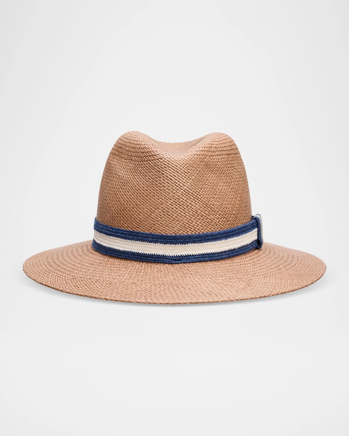 A versatile essential, this & nbsp;woven fedora from & nbsp;Brunello Cucinelli features a structured pinched crown and a striped grosgrain ribbon with a monili-trimmed tab. Pinched crown Wide brim Straw/brass/raffia Made in Italy