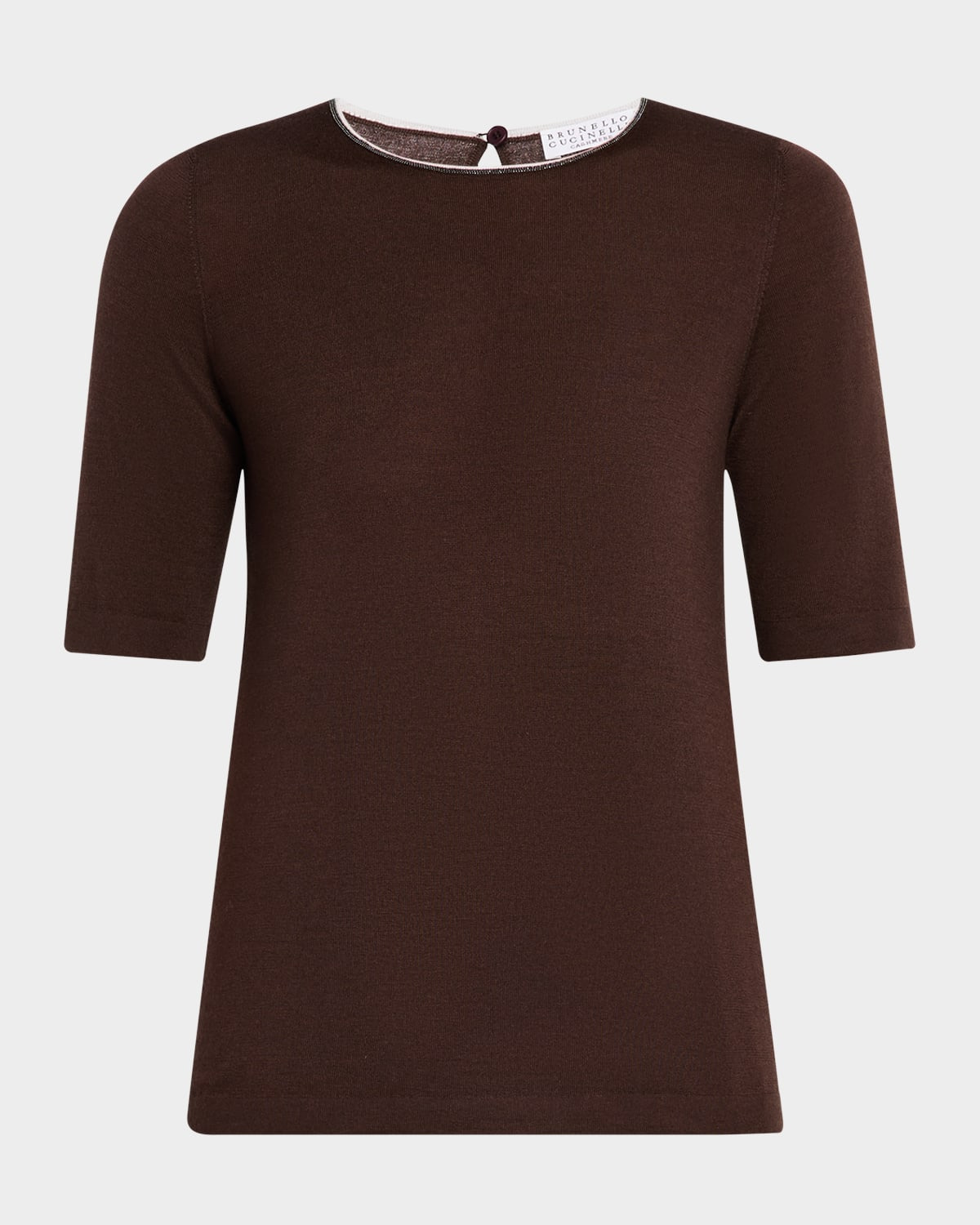 - Brunello Cucinelli knit top features a neckline outlined with monili trim - Crew neckline; button/keyhole back - Short sleeves - Hip length - Relaxed fit - Pullover style - Cashmere/silk - Made in Italy