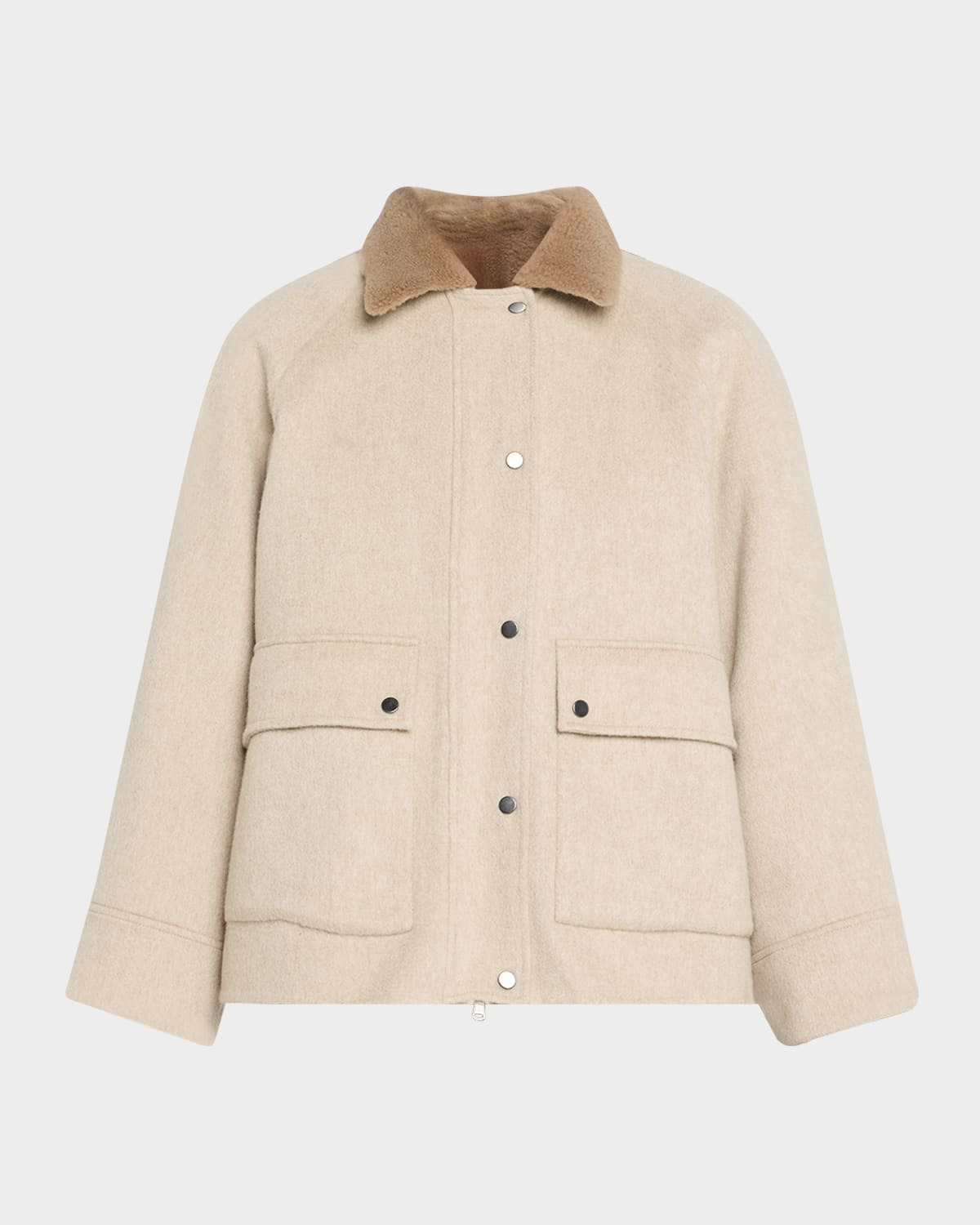 - Brunello Cucinelli brushed cashmere coat featuring removable natural and dyed sheep shearling (Spain) liner and collar - Spread collar; snap concealed zip front - Long raglan sleeves - Hip snap-flap pockets - Straight fit - Hip length - Cashmere/shearling - Lining: Shearling - Dry clean - Made in Italy