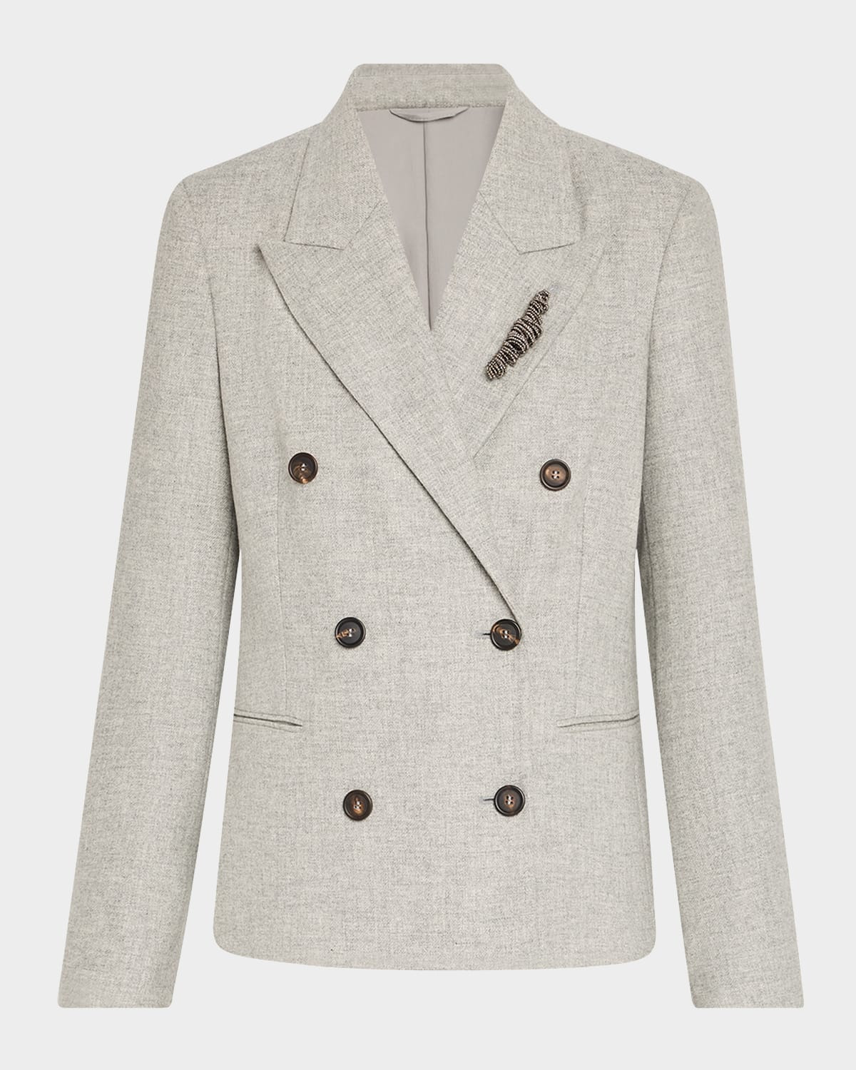 - Brunello Cucinelli blazer jacket in cashmere-blend flannel with contrast buttons - Peak lapels; double-breasted front - Long sleeves; button cuffs - Chest and hip welt pockets - Straight fit - Hip length - Virgin wool/cashmere - Lining: Acetate/silk/polyester - Dry clean - Made in Italy