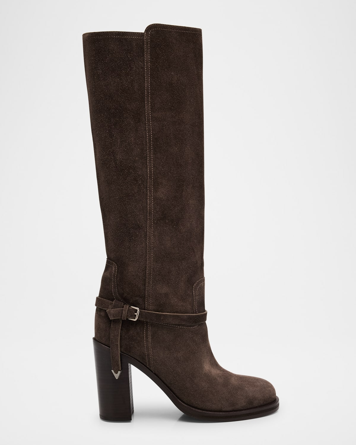 Featuring a premium Italian suede composition, the City kneehigh boots by Brunello Cucinelli are adorned with a belted detail 3.15 in / 80 mm block heel Round toe Side zip eases dress Leather lining and outsole Made in Italy