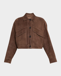 Brunello Cucinelli shirt jacket is crafted of couture sheep suede Point collar; singlebreasted front Long sleeves; button cuffs Chest flap pockets Boxy fit Cropped length Buttontab hem Leather Lining: Acetate/silk Dry clean Made in Italy