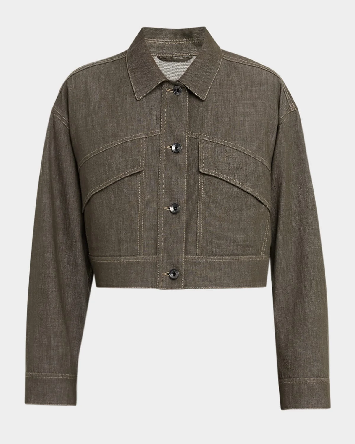 Brunello Cucinelli denim jacket is crafted from a nonfaded gray washed denim accented with contrast topstitching Point collar; singlebreasted front Long sleeves; button cuffs Chest flap pockets Relaxed fit Cropped length Buttonta hem Cotton Made in Italy
