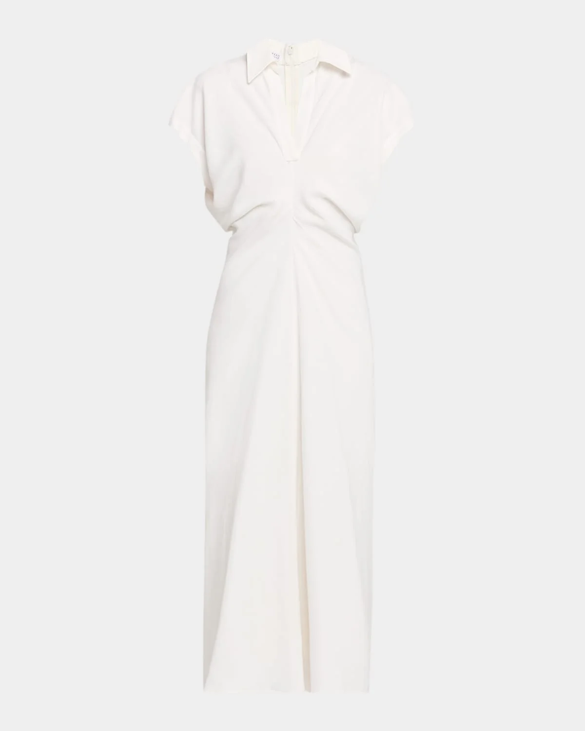 Brunello Cucinelli polo shirtdress is crafted of fluid linen twill featuring a figureflattering draped waist and monili trimmed pull tab on the back Spread collar; split V front Short sleeves Aline silhouette Hem falls below the knee Invisible back zip Viscose/linen Lining: Cotton/elastane Dry clean Made in Italy