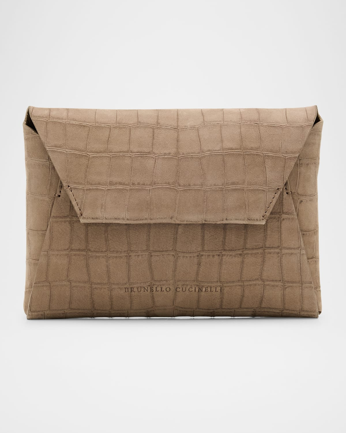 - Brunello Cucinelli "Duo" pouchette clutch bag in croc-embossed suede - Detachable monili chain crossbody strap - Can be worn as a clutch or crossbody bag - Envelope flap top with magnetic closure - Interior, one card slot - Approx. 5.5"H x 7.9"W x 0.8"D - Made in Italy