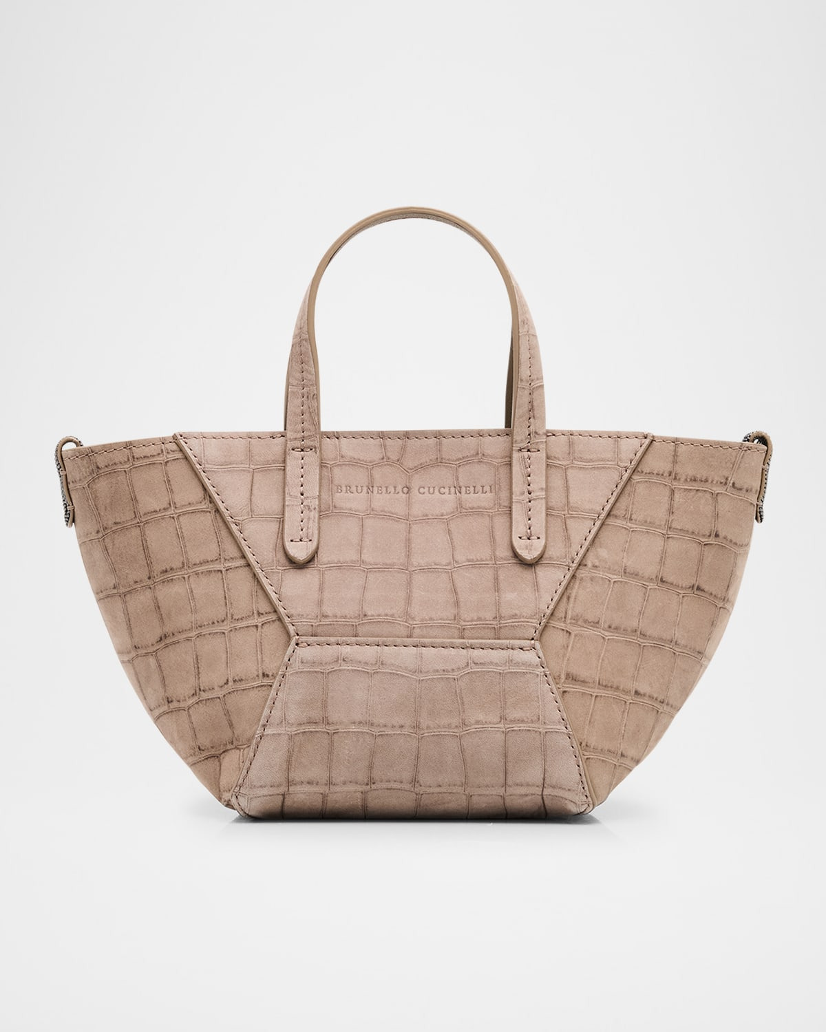 - Brunello Cucinelli "Duo" shopper tote bag in croc-embossed suede - Top handles - Detachable, adjustable crossbody strap with monili trim - Can be worn as a top handle or shoulder/crossbody bag - Open top with magnetic closure - Interior, one card slot - Approx. 5.5"H x 9.8"W x 3.9"D - Made in Italy
