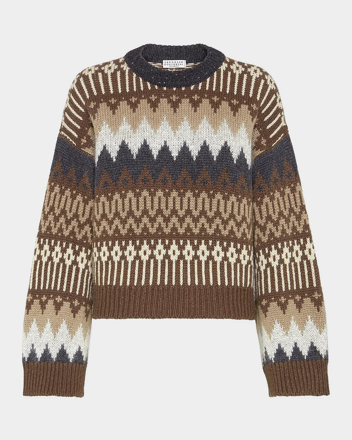 Brunello Cucinelli sweater is handcrafted of soft cashmere with a Fair Isle intarsia and paillette embellishment Crew neckline Long sleeves Drop shoulders Boxy fit Ribbed cuffs and hem Pullover style Cashmere Made in Italy