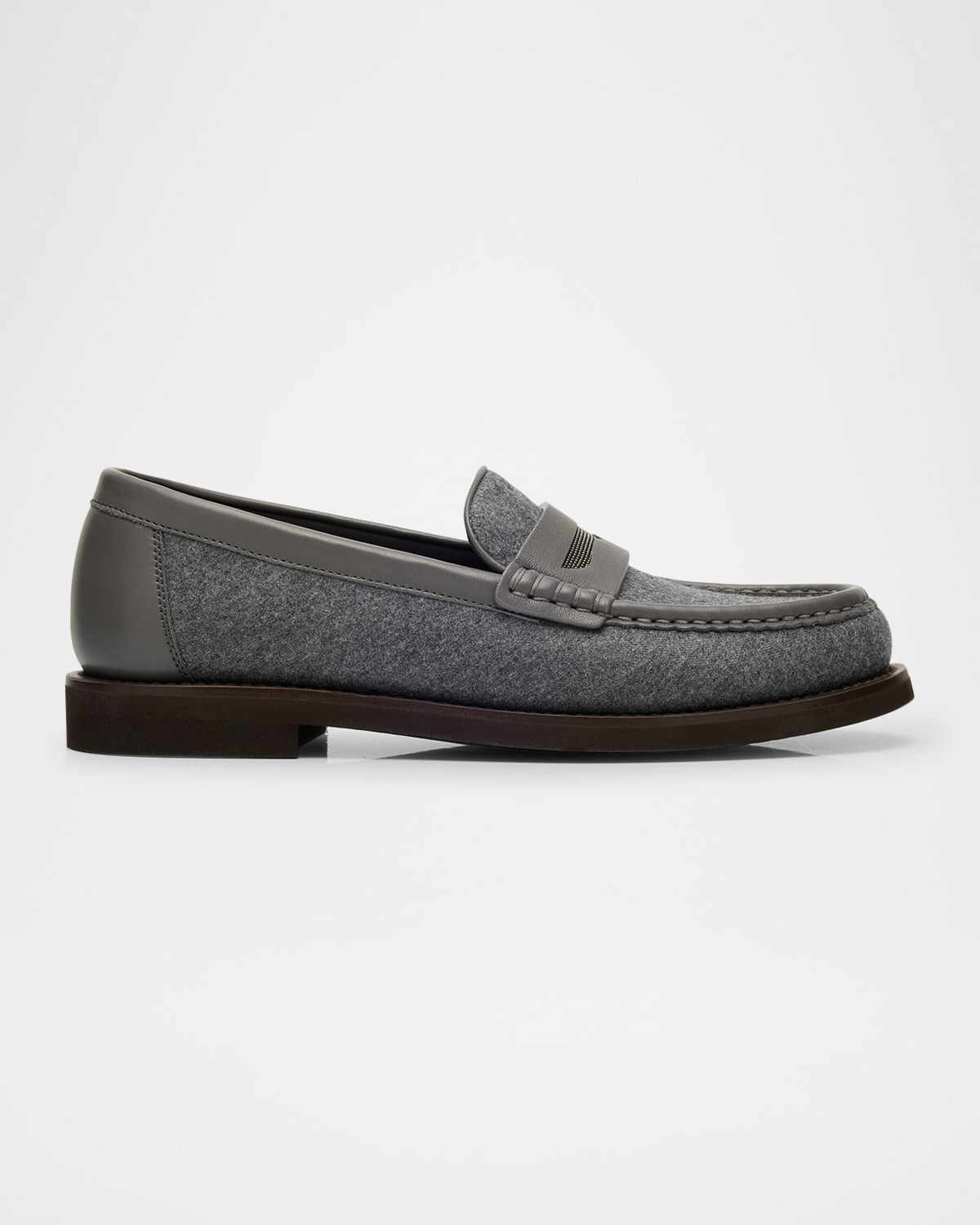 - Brunello Cucinelli felt loafers with smooth leather trim - Flat heel - Almond moc toe - Notched vamp with Monili keeper strap - Slip-on style - Rubber outsole - Lining: Leather/cotton - Professional cleaning recommended, spot clean - Made in Italy