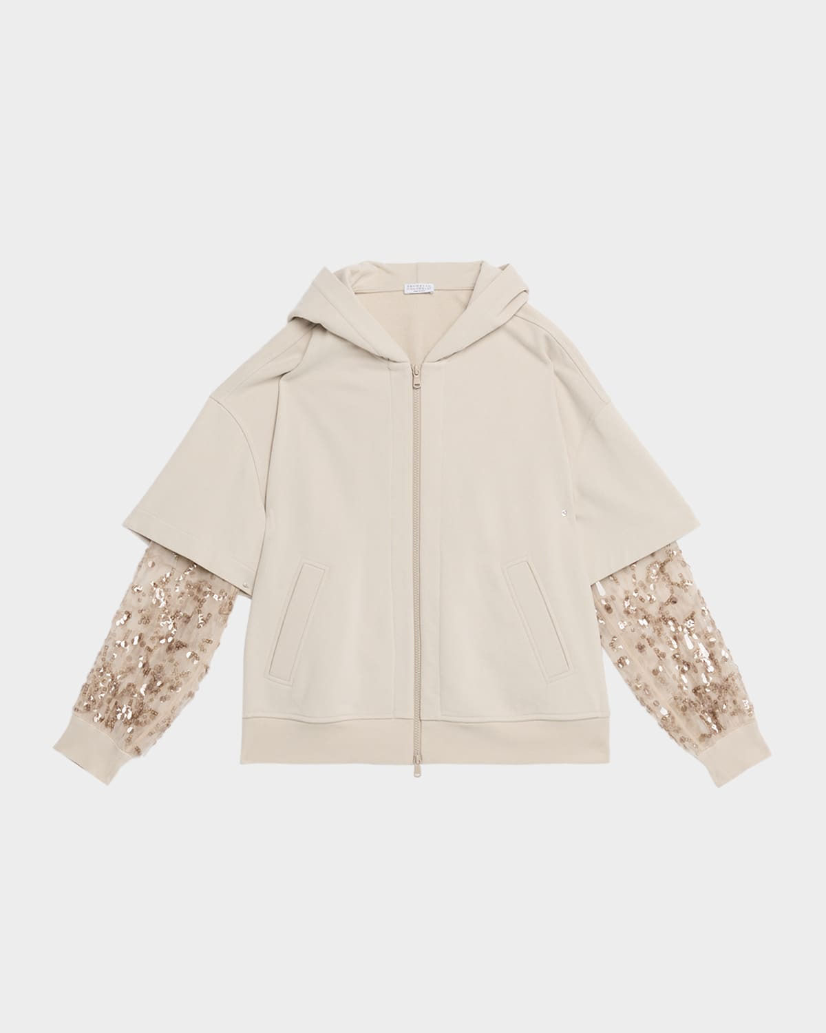 - Brunello Cucinelli knit jacket enhanced with sheer sequin-embellished raindrop sleeves - Hooded neckline; two-way zip-front - Dropped shoulders - Long sleeves - Side pockets - Relaxed fit - Hem falls to the hip - Cotton - Made in Italy